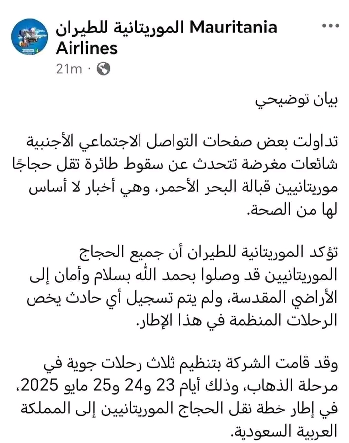 نفت شركة الموريتانية للطيران ما وصفته “بالشائعات المغرضة” التي تداولتها صفحات التواصل الاجتماعي الأجنبية، بخصوص سقوط طائرة تقل حجاجاً موريتانيين قبالة البحر الأحمر.
