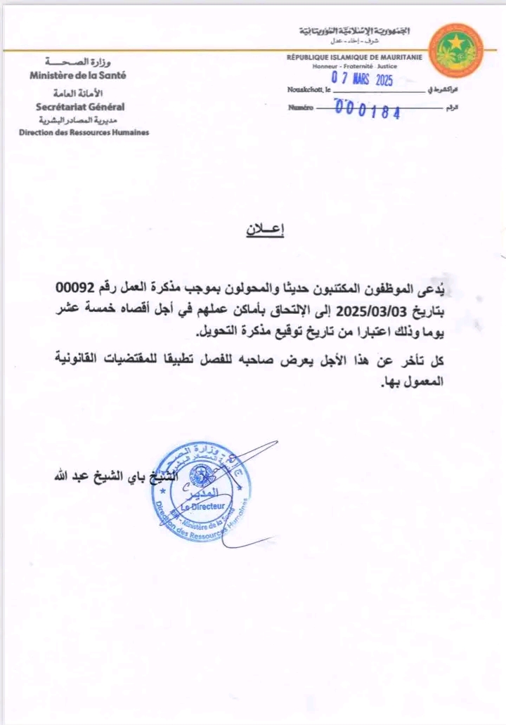 دعت وزارة الصحة، اليوم الجمعة، الموظفين الذين تم اكتتابهم حديثا، والذين تم تحويلهم بموجب مذكرة العمل رقم 00092 بتاريخ 03/03/2025، إلى الالتحاق بأماكن عملهم في أجل أقصاه خمسة عشر يوما اعتبارا من تاريخ توقيع مذكرة التحويل.