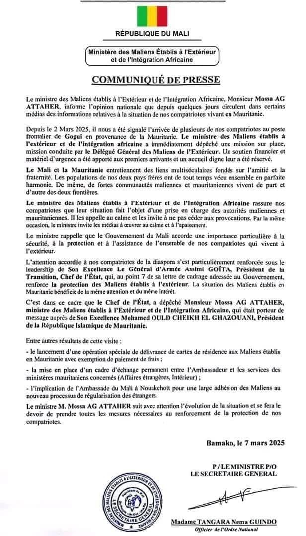 ودعت الحكومة المالية رعاياها في موريتانيا إلى الهدوء و”عدم الانجرار وراء الاستفزازات”، مضيفة أن وضعهم يحظى بمتابعة واهتمام السلطات المالية والموريتانية.