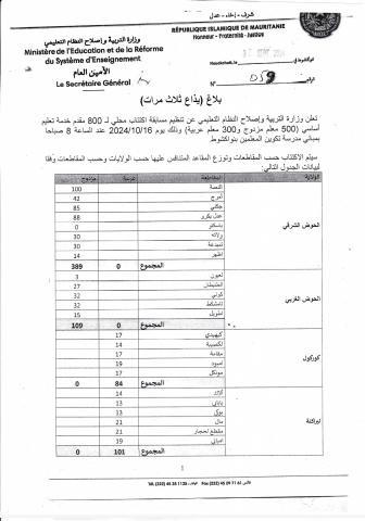 أعلنت وزارة التربية اليوم الاثنين عن مسابقة لاكتتاب 800 مقدم خدمة تعليم أساسي لسد النقص في تسع ولايات.