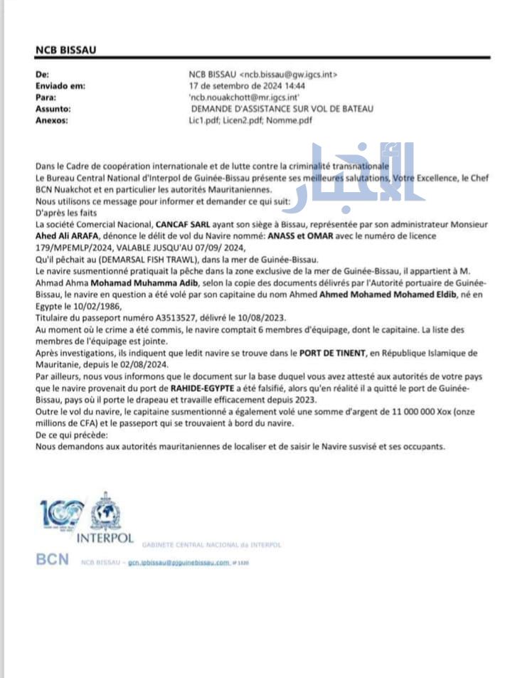 المكتب المركزي الوطني للإنتربول في غينيا بيساو، السلطات الموريتانية إلى "تحديد موقع سفينة ومصادرة محتوياتها"، بعدما أظهرت التحقيقات "وجودها في ميناء تانيت بالجمهورية الإسلامية الموريتانية منذ 2 أغسطس 2024".
