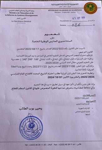 ونص التعميم على أن السنوات (أول ابتدائي ثاني ابتدائي، ثالث ابتدائي) حصرية على التعليم العمومي خلال العام الدراسي 2025/2024.