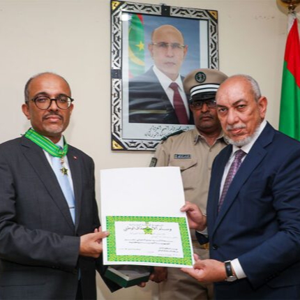 وسَلَّمَ التوشيحَ للسفير التونسي، وزيرُ العدل، وزيرُ الخارجية وكالة محمد محمود ولد الشيخ عبد الله بن بيه.