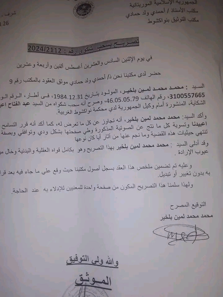 وقع المواطن محمد ولد محمد لمين ولد بلخير على سحب شكوى كان قد تقدم بها إلى العدالة ضد الصحفي عبد الفتاح ولد اعبيدنا، وذلك لدى مكتب الموثق أحمدي ولد حمادي.