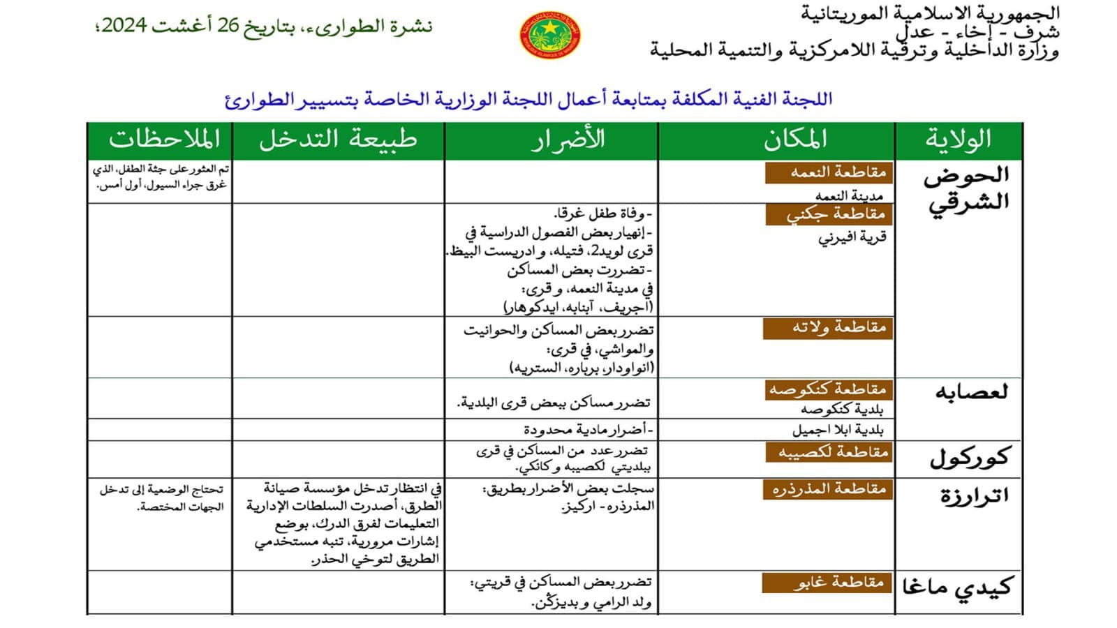 أعلنت الحكومة الموريتانية اليوم الاثنين وفاة طفلين جراء سيول عرفتها المنطقة الشرقيه.