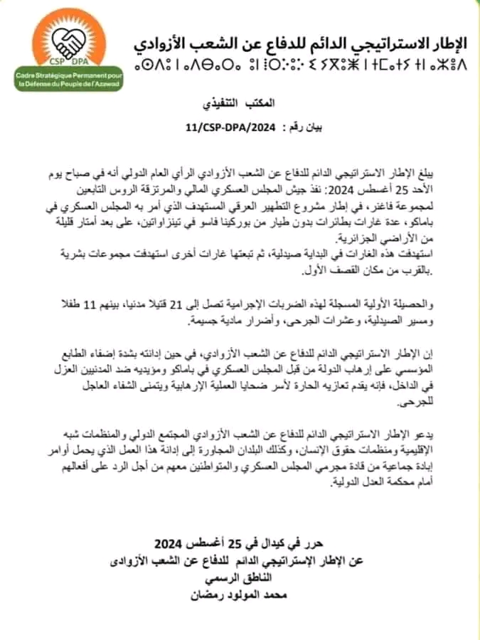 أكد الإطار الاستراتيجي الدائم للدفاع عن الشعب الأزوادي أن الحصيلة الأولية للضربات الجوية التي نفذها الجيش المالي صباح اليوم الجمعة على منطقة تينزواتين، هي 21 قتيلا، وعشرات الجرحى، إضافة لأضرار مادية جسيمة.