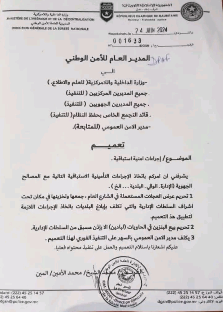 أصدر المدير العام للأمن الوطني الفريق محمد الشيخ ولد محمد الأمين صباح اليوم جملة من الاجراءات تضمنت حظر بيع البنزين فى الحاويات إلا بإذن مسبق من السلطات الإدارية ،ومنع عرض العجلات المستعملة فى الشارع العام