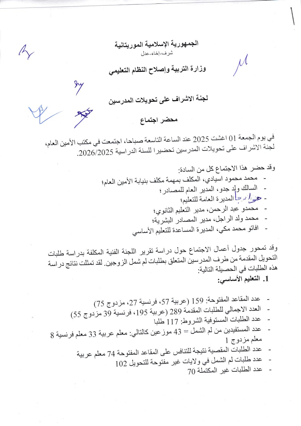 أعلنت وزارة التربية وإصلاح النظام التعليمي، عبر لجنة الإشراف على تحويلات المدرسين، نتائج دراسة ملفات التحويل المقدمة من المدرسين استعدادا للعام الدراسي 2025-2026، وذلك خلال اجتماع عقدته اللجنة صباح الجمعة فاتح أغسطس 2025 بمكتب الأمين العام.