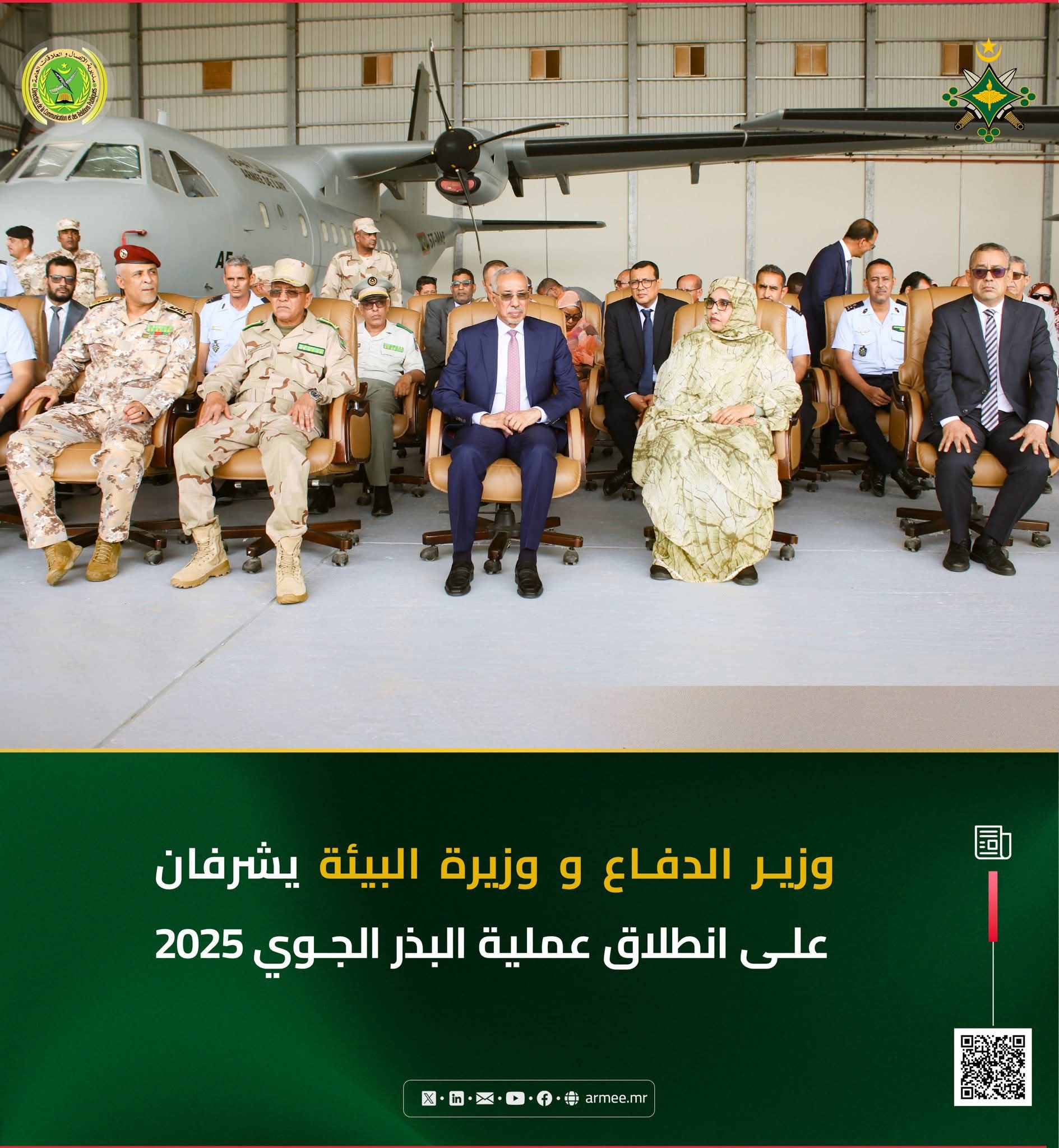 أشرف وزير الدفاع وشؤون المتقاعدين وأولاد الشهداء؛ السيد حنن ولد سيدي، رفقة وزيرة البيئة والتنمية المستدامة؛ السيدة مسعودة منت بحام، وقائد الأركان العامة للجيوش؛ الفريق محمد فال الرايس الرايس، وقائد أركان الجيش الجوي؛ الفريق محمد الشبخ بيده، اليوم الخميس 31 يوليو 2025، بمقر قيادة أركان الجيش الجوي، على انطلاق عملية البذر الجوي لسنة 2025.