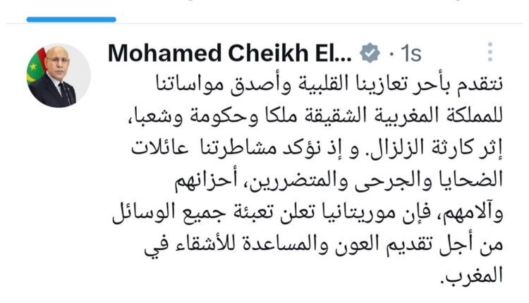 وقال ولد الغزواني في البرقية التي نشرتها الوكالة الموريتانية للأنباء (رسمية): “تلقيت ببالغ الأسى وعميق التأثر نبأ الزلزال العنيف الذي ضرب مساء أمس عددا من المدن المغربية”.