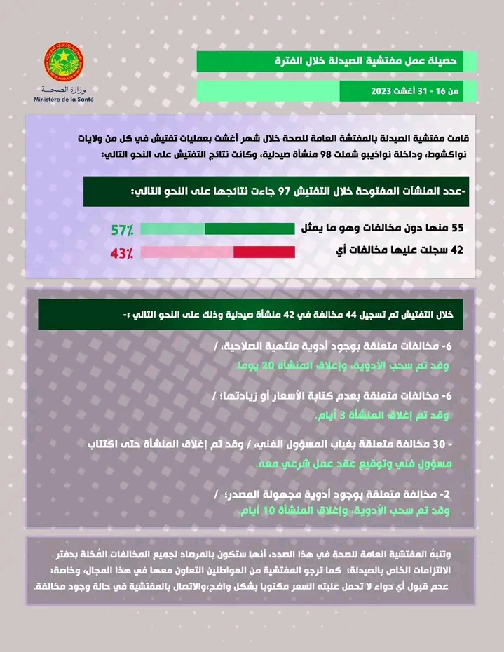 أعلنت وزارة الصحة أن مفتشية الصيدلة بالمفتشية العامة للصحة قامت بعمليات تفتيش خلال شهر أغسطس شملت 98 منشأة صيدلية، في كل من ولايات نواكشوط، وداخلت انواذيبو.