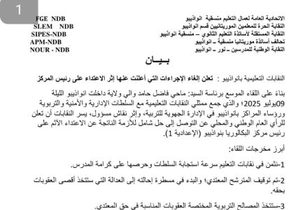وأفادت النقابات في بيان لها أن سبب التراجع جاء بناءً على نتائج اجتماعها مع والي نواذيبو، ماحي فاضل حامد.