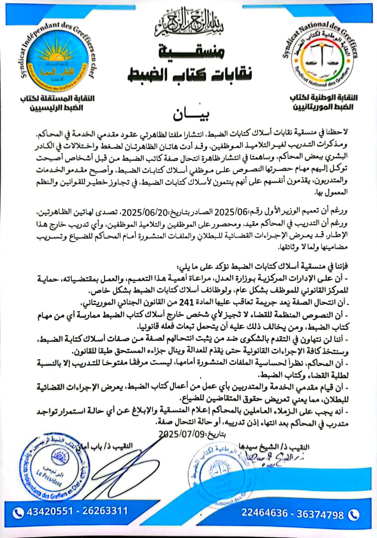 عبّرت منسقية نقابات أسلاك كتابات الضبط، عن استنكارها لما اسمته، ظاهرتي عقود مقدمي الخدمة في المحاكم، ومذكرات التدريب لغير التلاميذ الموظفين.