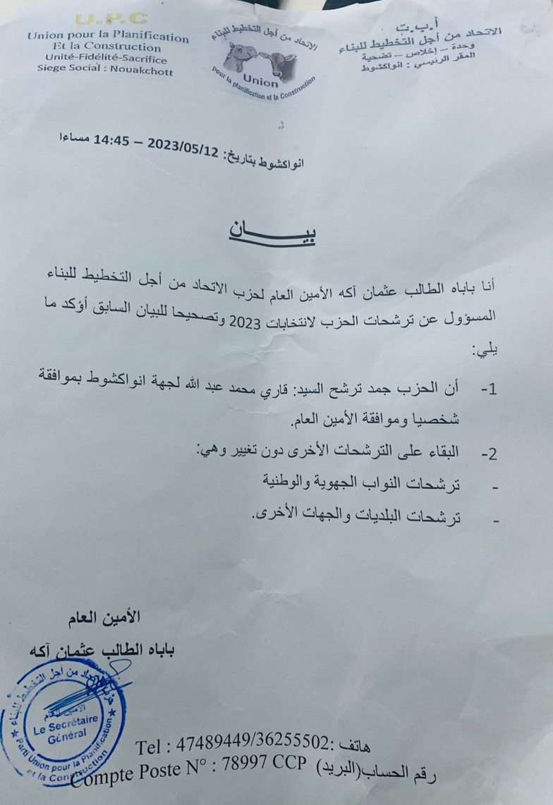 تراجع الأمين العام لحزب "الاتحاد من أجل التخطيط للبناء" باباه الطالب عثمان، عن بيان سابق قال فيه إن جميع لوائح الحزب ما تزال مترشحة ولم تجمد منها أي لائحة.