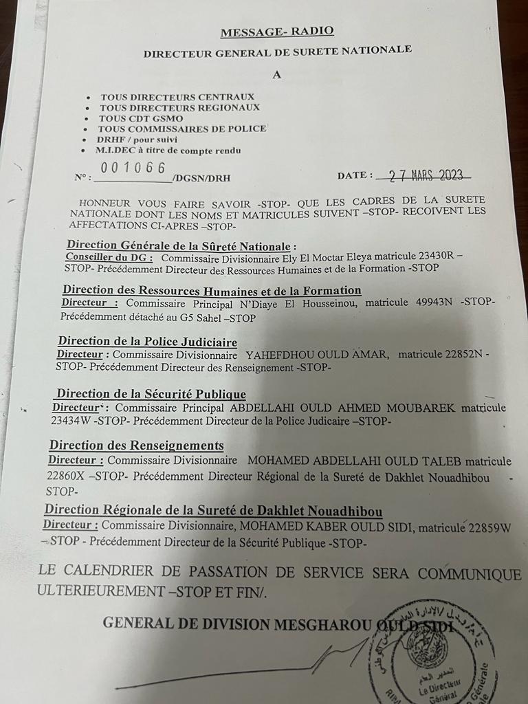 وقع المدير العام للأمن الفريق مسغارو ولد سيدي مذكرة بتعيين المفوض الإقليمي محمد عبد الله ولد الطلبة الملقب السفير، مديرا جديدا لأمن الدولة.