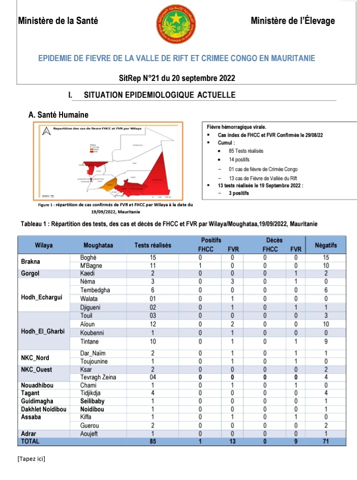 أظهرت معطيات لوزارتي الصحة والبيطرة تسجيل 14 إصابة بحمى الوادي المتصدع وحمى القرم النزفية في 6 ولايات، هي البراكنة، والحوض الشرقي، والحوض الغربي، إضافة إلى ولايات نواكشوط الشمالية، وداخلت نواذيبو ولعصابة.