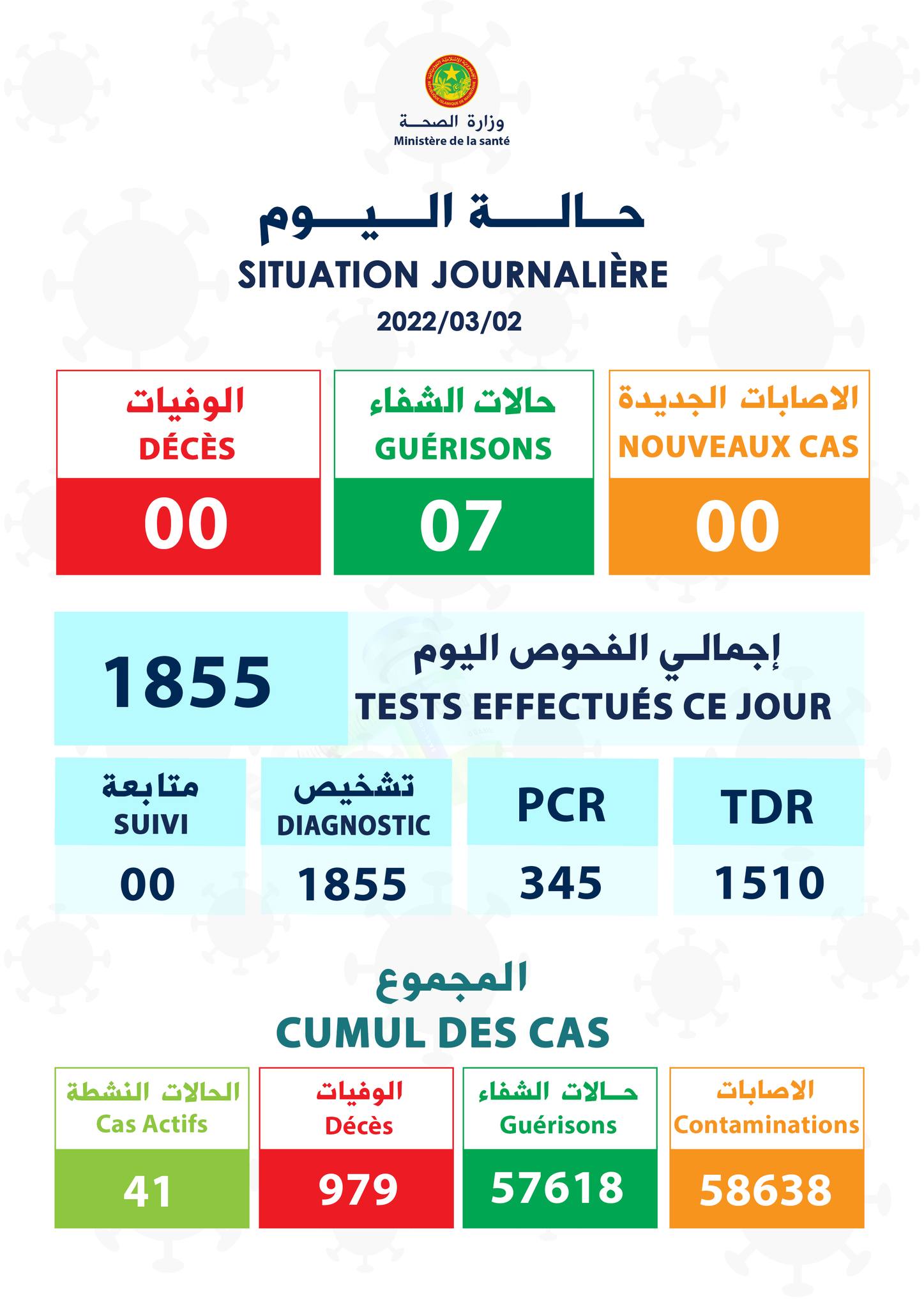 قالت وزارة الصحة مساء اليوم الأربعاء إنها لم تسجل خلال الأربع والعشرين ساعة الأخيرة أي إصابة جديدة بفيروس كورونا المستجد، ولا أي وفاة بسبب هذا الوباء، وهي المرة الثانية خلال هذه الأسبوع.