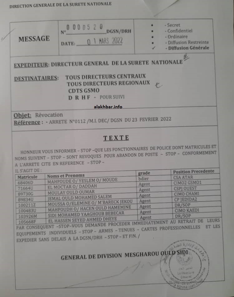 وقع المدير العام للأمن الوطني الفريق مسقارو ولد سيدي قرارا بفصل ثمانية شرطيين بسبب التغيب عن أماكن عملهم.