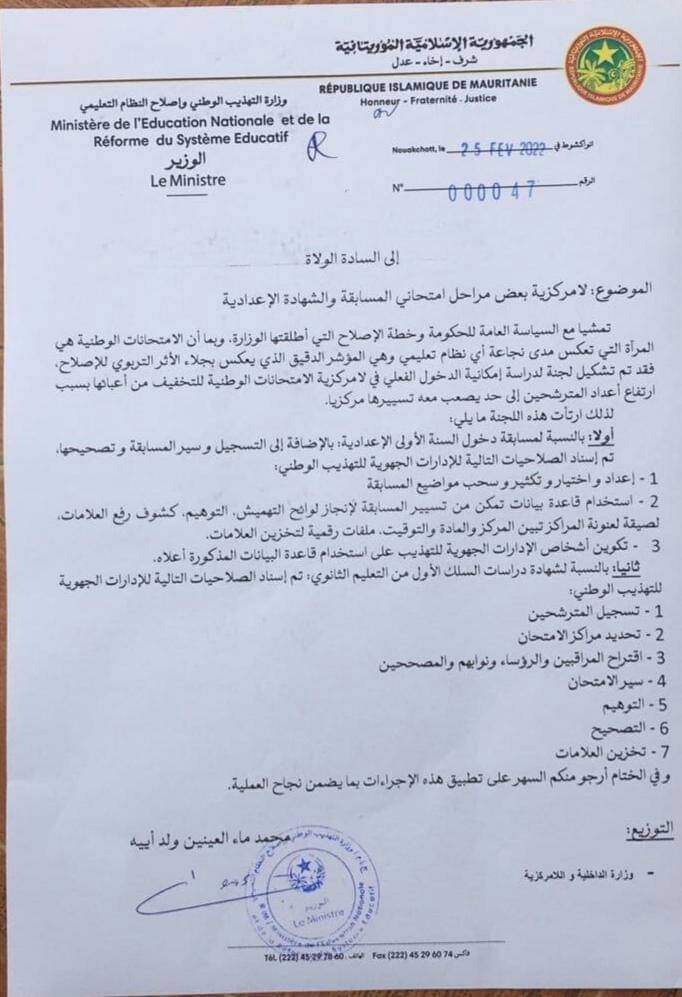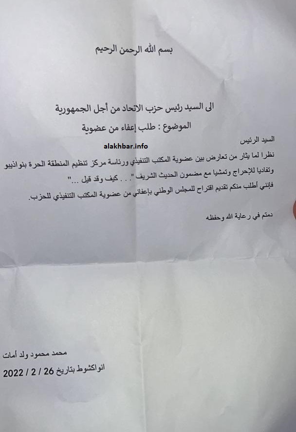 الرسالة التي بعث بها ولد أمات إلى رئيس الحزب، قال فيها إن طلب الإعفاء جاء نتيجة لما يثار من «تعارض بين عضوية المكتب ورئاسة مركزتنظيم المنطقة الحرة».