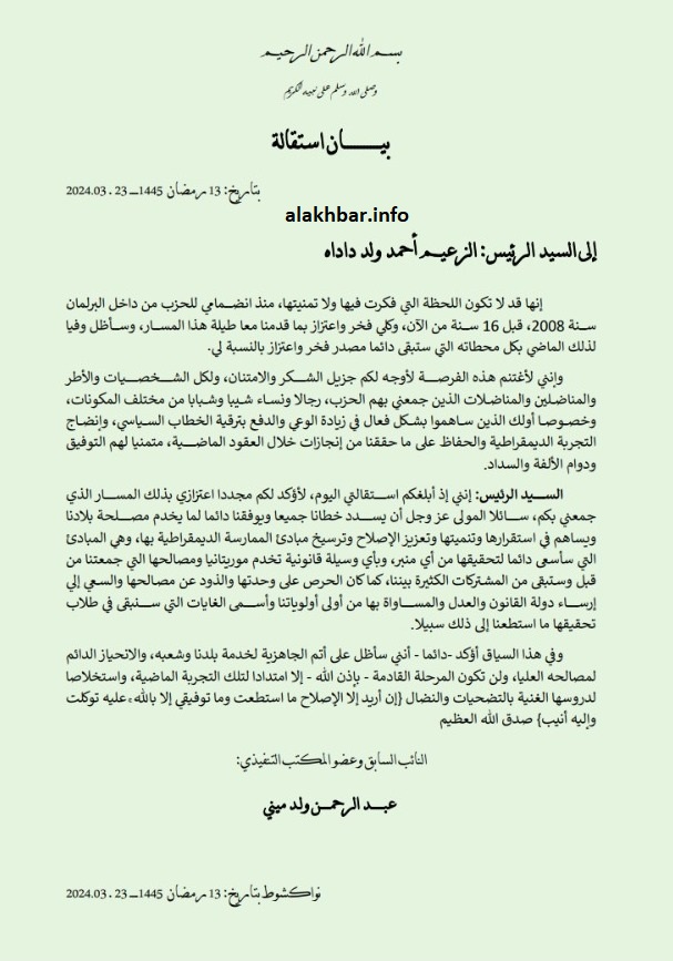 وأكد ولد ميني في الرسالة التي حصلت وكالة الأخبار المستقلة على نسخة منها على أن هذه اللحظة قد لا تكون اللحظة التي فكر فيها ولا تمناها، منذ انضمامه للحزب من داخل البرلمان سنة 2008، قبل 16 سنة من الآن.