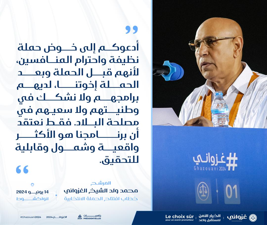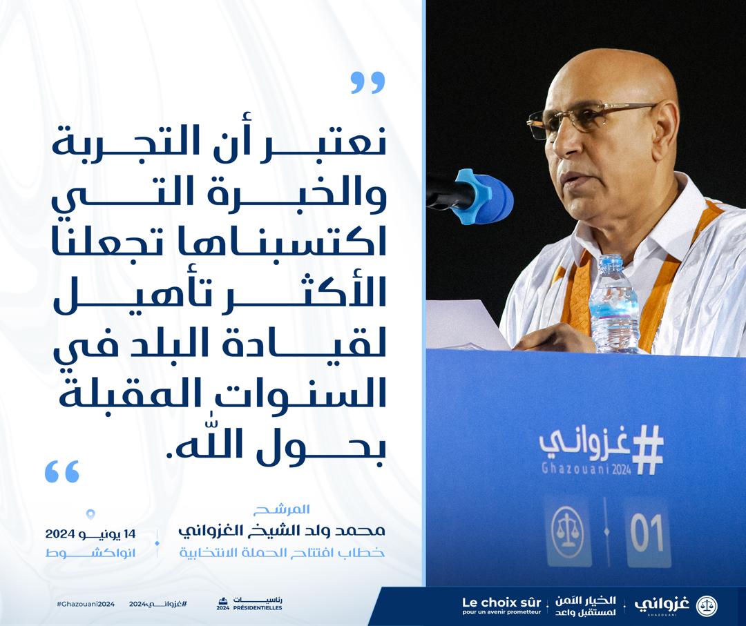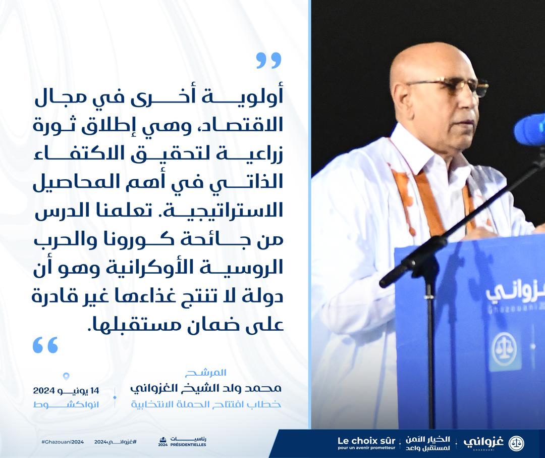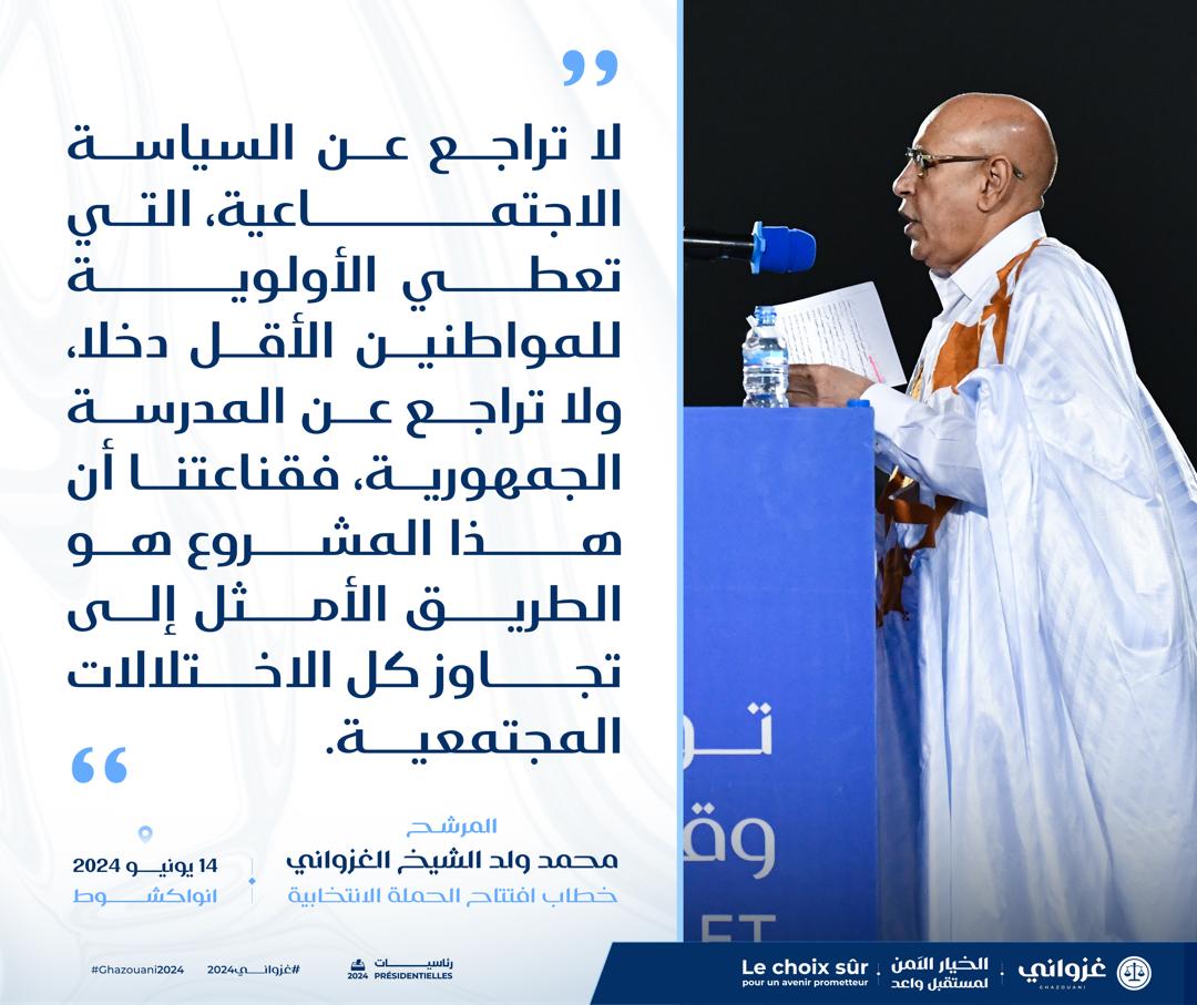 وفيما يخص السياسة الاجتماعية، التي تعطي الأولوية للمواطنين الأقل دخلا، قال غزواني إنه لا تراجع عنها، ولا عن المدرسة الجمهورية، ولا عن التهدئة السياسية، فالقناعة أن هذا المشروع هو الطريق الأمثل إلى تجاوز كل الاختلالات المجتمعية.