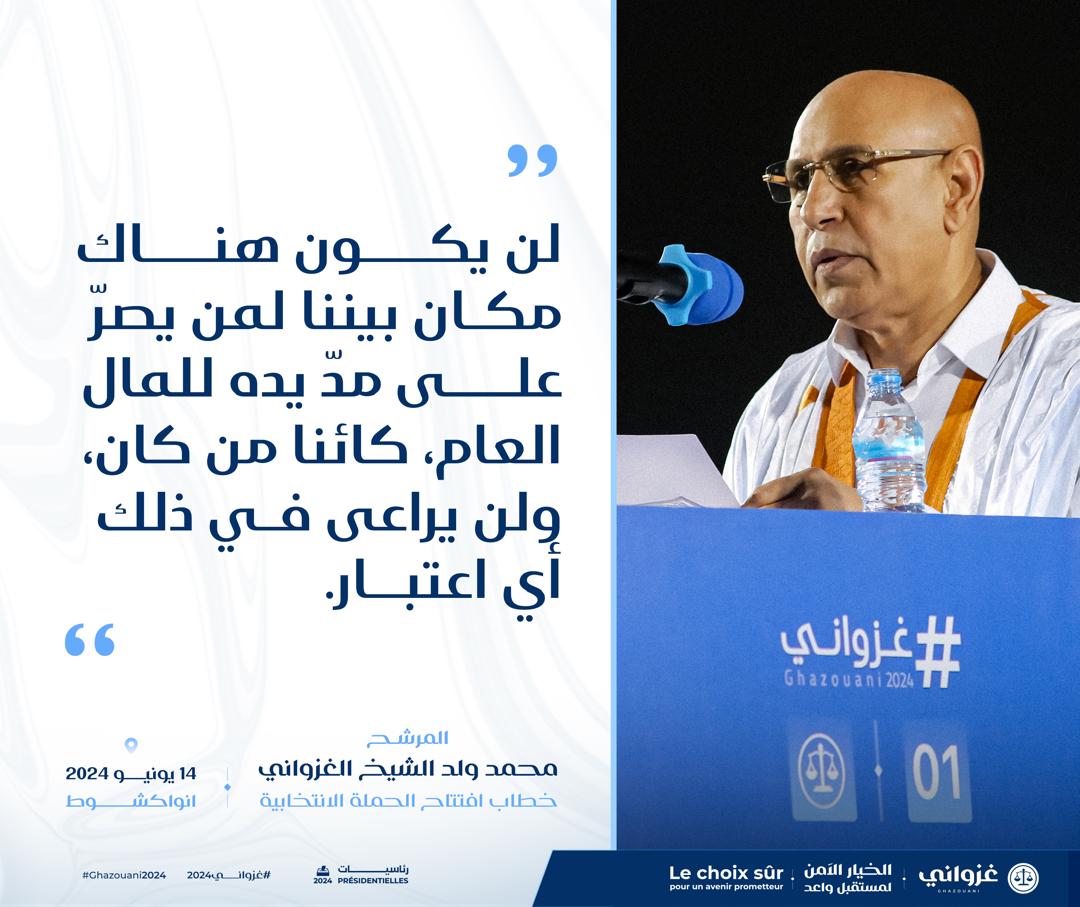 كما شدد ولد غزواني على أنه لن يكون هناك مكان لمن يصر على مد يده للمال العام، كائنا من كان، مؤكدًا أنه لن يراعى في ذلك أي اعتبار.