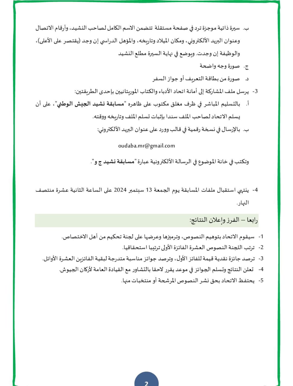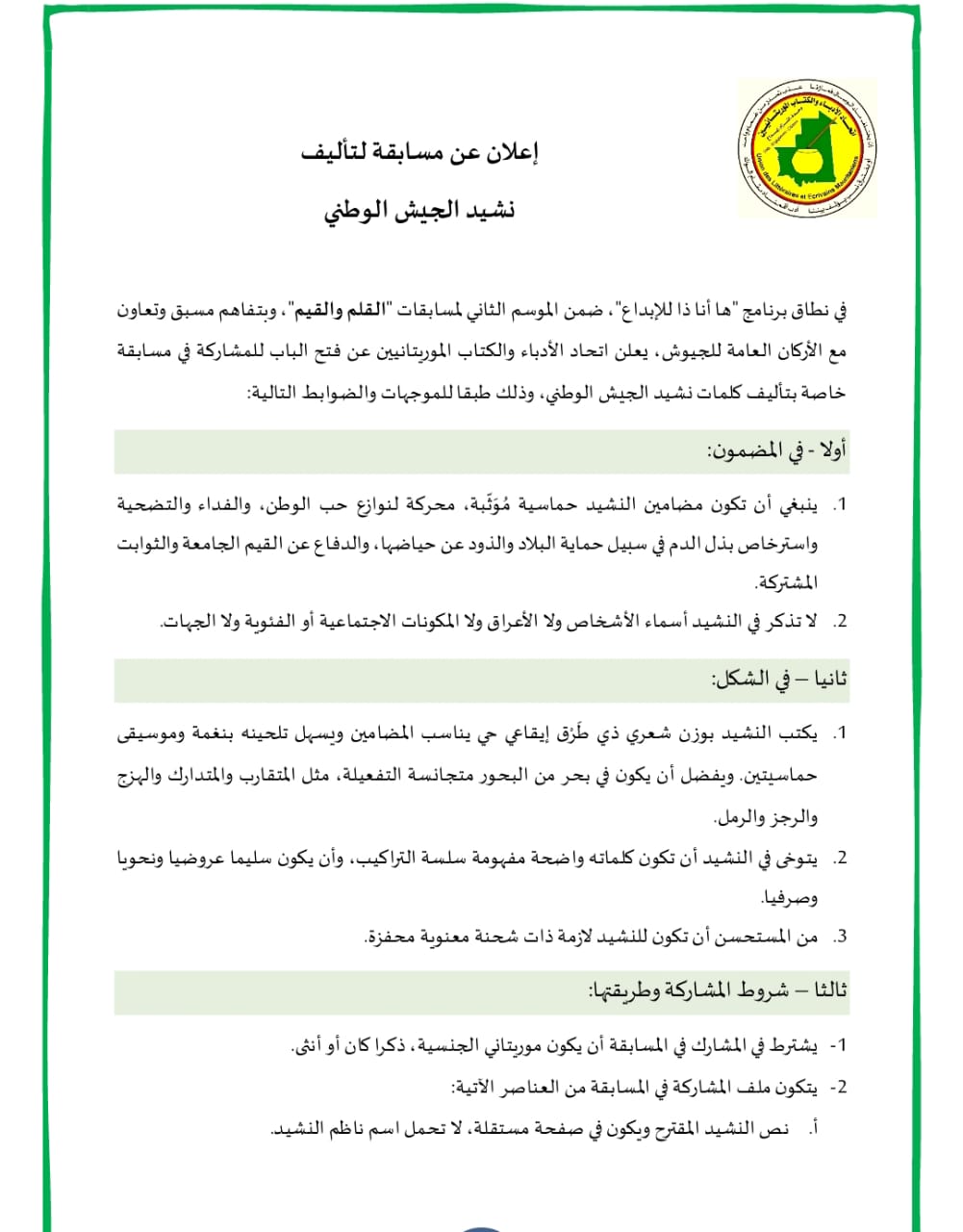 أعلن اتحاد الكتاب والأدباء الموريتانيين عن مسابقة لتأليف نشيد للجيش الوطني. وستنظم المسابقة بالتعاون بين الاتحاد ومديرية الاتصال والعلاقات العامة بالأركان العامة للجيوش.