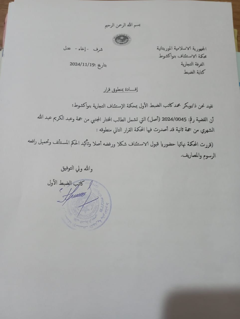 محكمة الاستئناف التجارية بانواكشوط قررت نهائيا و حضوريا قبول استئناف الطرف الثاني شكلا و رفضة أصلا و في المقابل تأكيد الحكم المستأنف و تحميل رافعه دفع الرسوم و المصاريف القضائية .