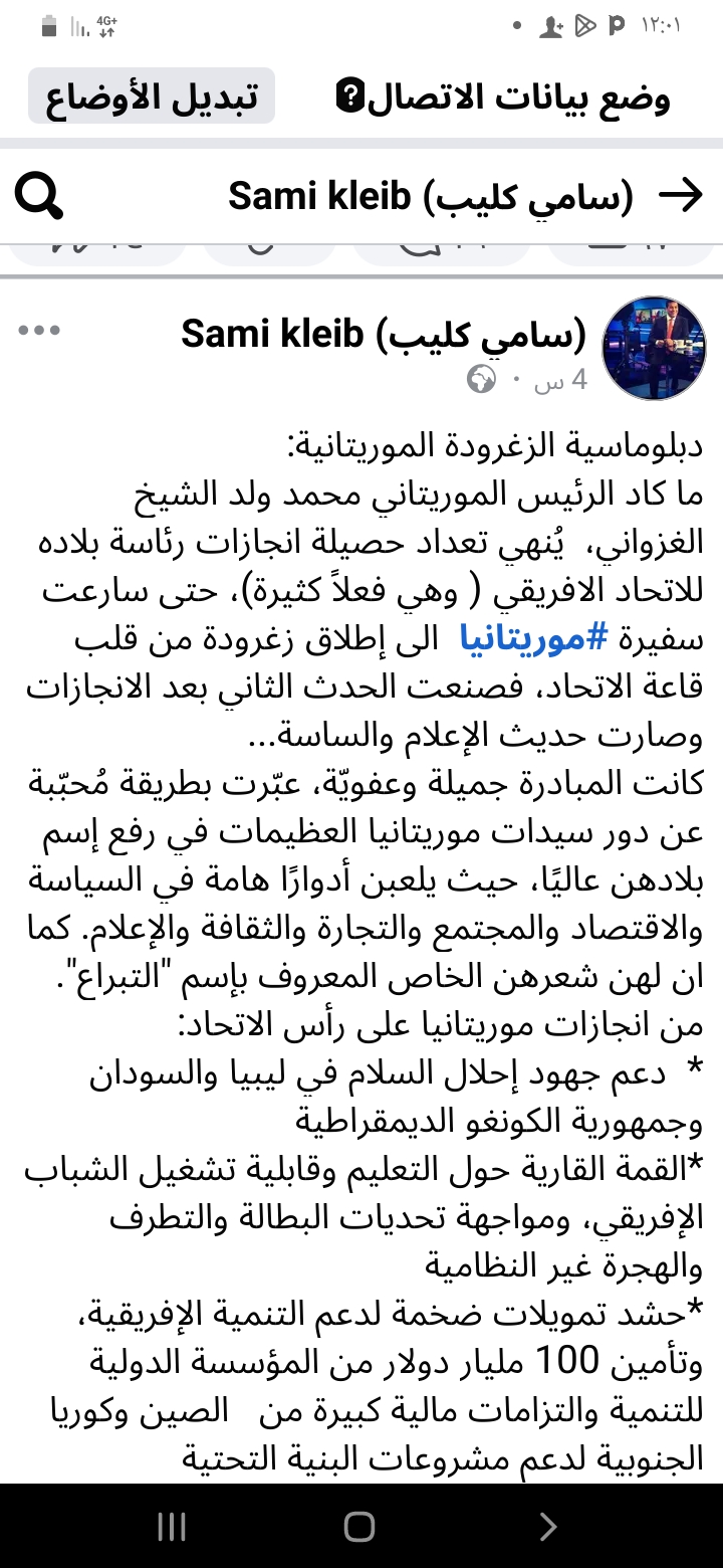 ما كاد الرئيس الموريتاني محمد ولد الشيخ الغزواني، يُنهي تعداد حصيلة انجازات رئاسة بلاده للاتحاد الافريقي ( وهي فعلاً كثيرة)، حتى سارعت سفيرة #موريتانيا الى إطلاق زغرودة من قلب قاعة الاتحاد، فصنعت الحدث الثاني بعد الانجازات وصارت حديث الإعلام والساسة...