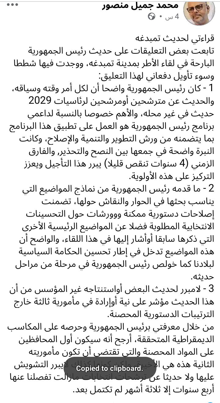 وأوضح ولد منصور في منشور على فيسبوك عنونه ب " قراءة في حديث تمبدغه" أن معرفته بالرئيس تجعلها ترجح التزامه بالمواد الدستورية التي تحدد عدد المأموريات، داعيا إلى التركيز على المأمورية الحالية وأهدافها التنموية.