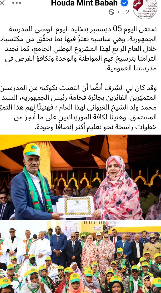 أشادت وزيرة التربية، السيدة هدى باباه، في تدوينة نشرتها على حسابها الشخصي في فيسبوك، بـ المكتسبات التي تحققت خلال العام الرابع لمشروع المدرسة الجمهورية، وذلك بمناسبة تخليد اليوم الوطني للمدرسة الجمهورية الموافق 05 ديسمبر.