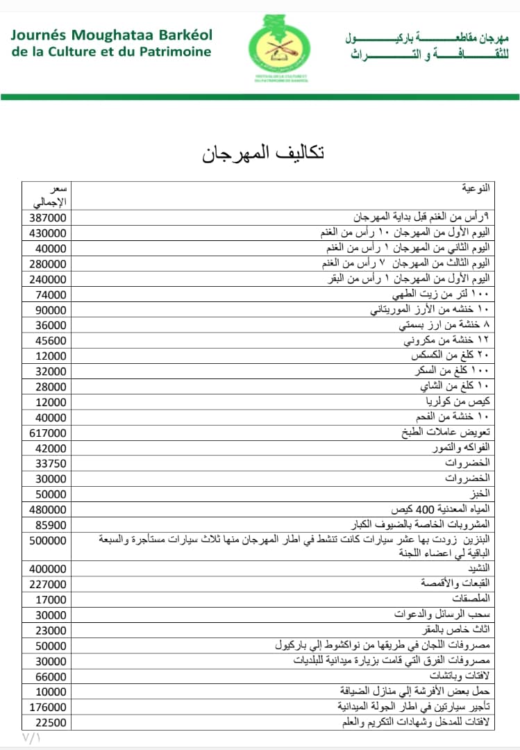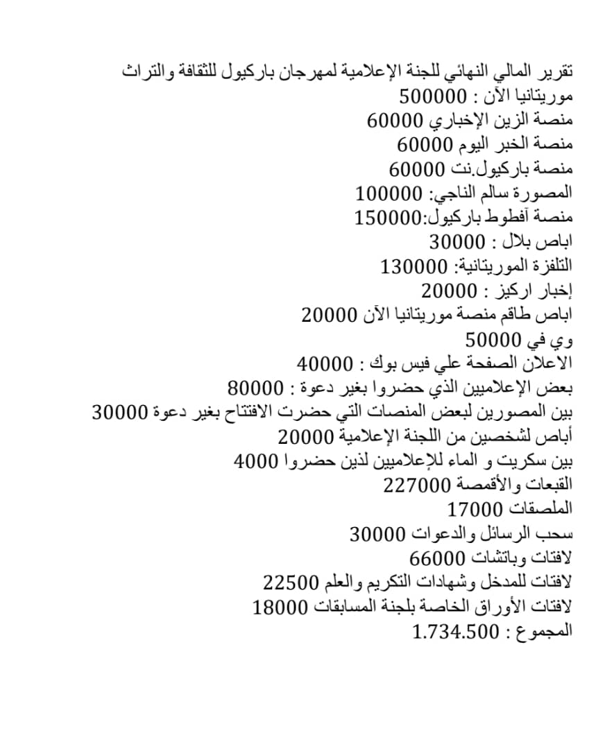 تتشرف اللجنة المنظمة لمهرجان مقاطعة باركيول للثقافة والتراث برئاسة رئيس المهرجان المصطفى ولد بابه بتقديم أسمى آيات الشكر والعرفان لكل من ساهم في إنجاح فعاليات النسخة الأولى من هذا الحدث الثقافي البارز، الذي أقيم أيام 26، 27، و28 سبتمبر 2025، تحت شعار: باركيول قلب نابض وأمل يتجدد.