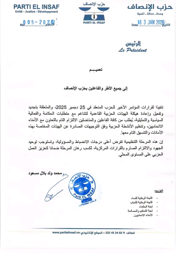 أصدر رئيس حزب الإنصاف،محمد ولد بلال مسعود، تعميماً موجهاً إلى كافة أطر والفاعلين في الحزب، يحثهم فيه على الالتزام الصارم بمتطلبات المرحلة التنظيمية الجديدة