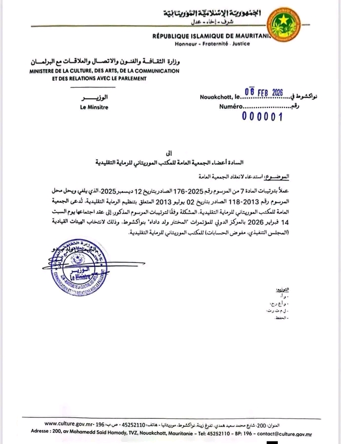 أعلنت وزارة الثقافة والفنون والاتصال والعلاقات مع البرلمان عن استدعاء أعضاء الجمعية العامة للمكتب الموريتاني للرماية التقليدية للمشاركة في أشغال الجمعية العامة العادية.