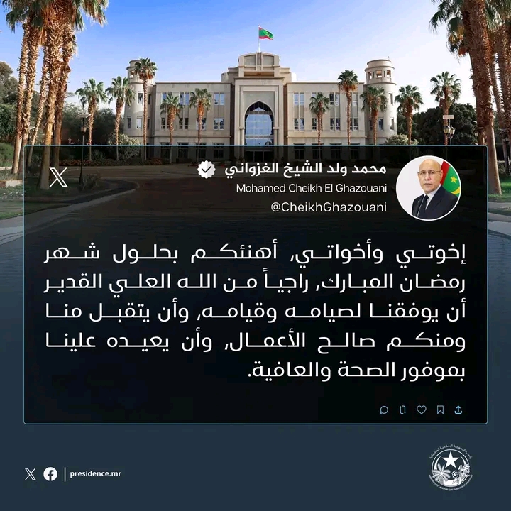 هنأ رئيسِ الجمهورية، محمد ولد الشيخ الغزواني، عبر منصة «إكس»، الشعب الموريتاني بحلول شهر رمضان المبارك.