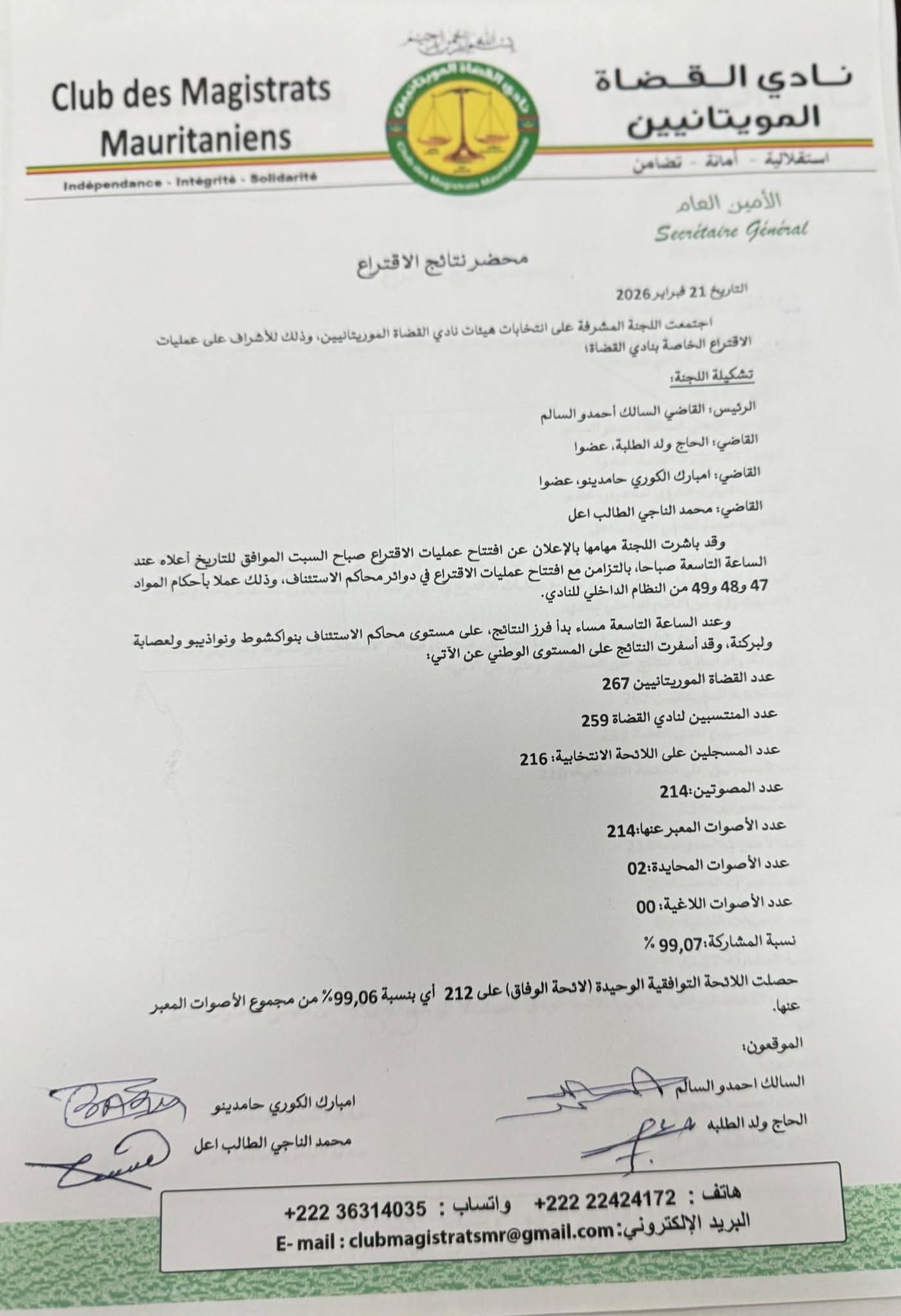 أسفرت انتخابات هياكل نادي القضاة الموريتانيين، التي جرت السبت 21 فبراير 2026، عن فوز اللائحة التوافقية الوحيدة بأغلبية ساحقة.