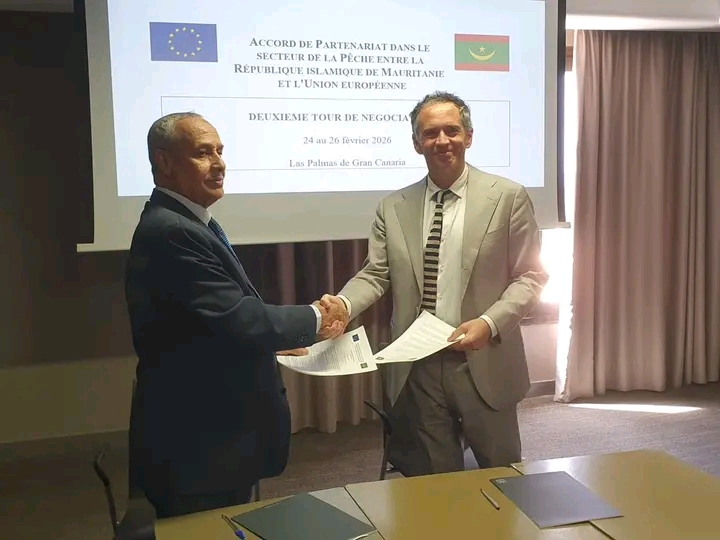 اختُتمت مساء اليوم الخميس 26 فبراير 2026 أعمال الاجتماع التفاوضي بين موريتانيا والاتحاد الأوروبي حول تحيين بروتوكول الشراكة في قطاع الصيد، وذلك بتوقيع محضر الاجتماع من طرف رئيسي الوفدين، في خطوة تعكس استمرار الحوار الفني بين الجانبين لتعزيز التعاون في مجال الصيد البحري.