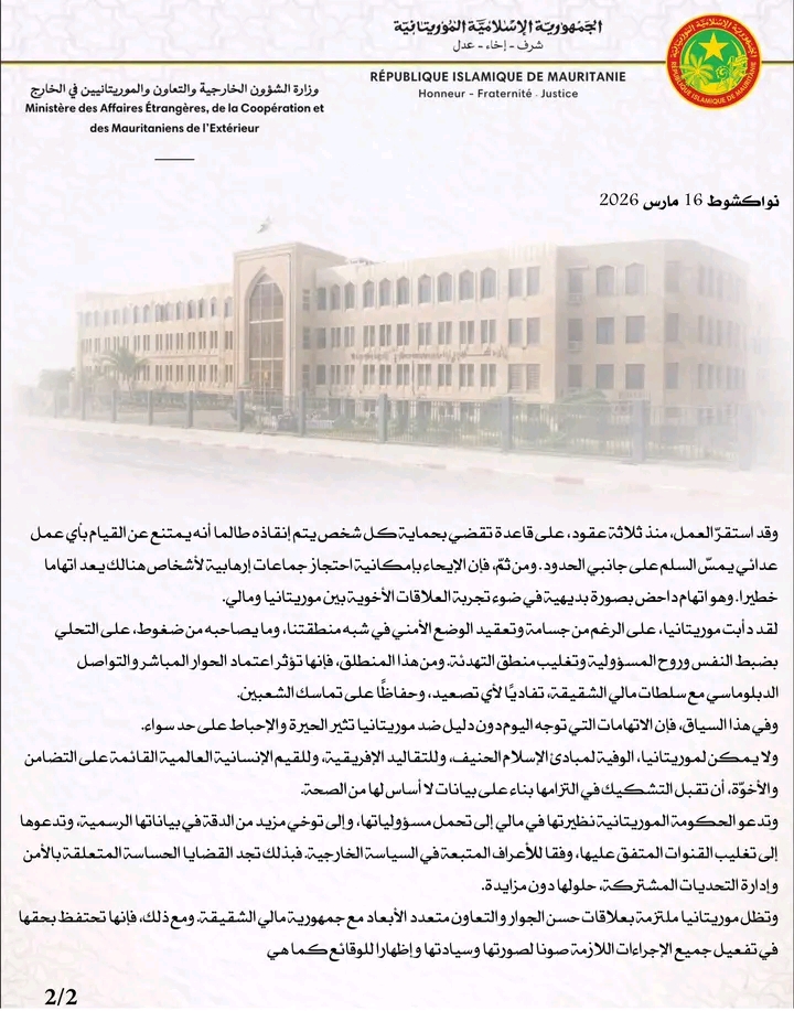 أعربت الحكومة الموريتانية عن استغرابها واستنكارها الشديدين للبيان الصادر عن الأركان العامة للجيش المالي، والذي زعم فرار عسكريين ماليين من "قبضة إرهابيين" داخل مخيم للاجئين على الأراضي الموريتانية. ووصف البيان الموريتاني هذه الادعاءات بأنها "اتهامات خطيرة لا أساس لها من الصحة