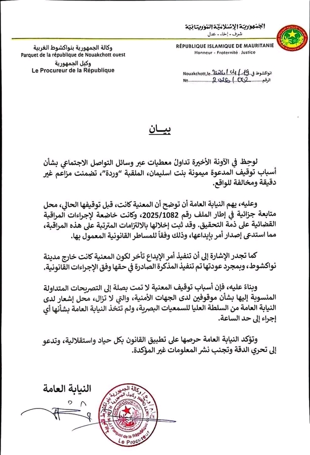 أعلنت وزارة العدل الموريتانية، في بيان أصدرته اليوم الأحد، توضيحاً للرأي العام حول ملابسات توقيف المدعوة ميمونة بنت اسليمان، الملقبة بـ "وردة"، وذلك رداً على ما تم تداوله مؤخراً عبر وسائل التواصل الاجتماعي من معطيات غير دقيقة ومخالفة للواقع