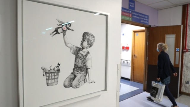 وتظهر لوحة الفنان البريطاني ”بانكسي” صبيا صغيرا يلعب مع ممرضة دمية باعتبارها بطلا خارقا بدلا من “باتمان” أو “سبايدر مان” .