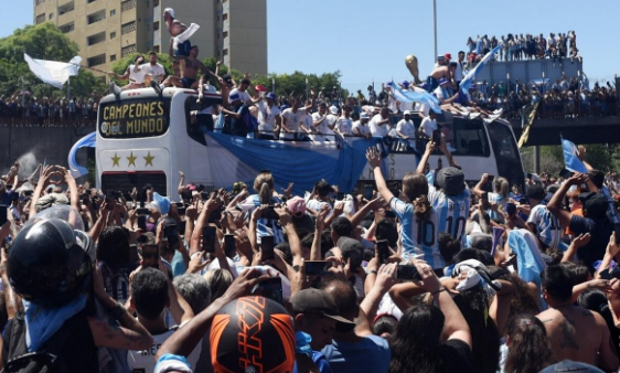 ولوح اللاعبون، بعد قضاء بضع ساعات في مقر تابع للاتحاد الأرجنتيني لكرة القدم بالقرب من المطار، للجماهير من حافلة مكشوفة مكتوب عليها "أبطال العالم" إضافة لثلاث نجوم تخليدا لحصد منتخب البلاد اللقب ثلاث مرات.