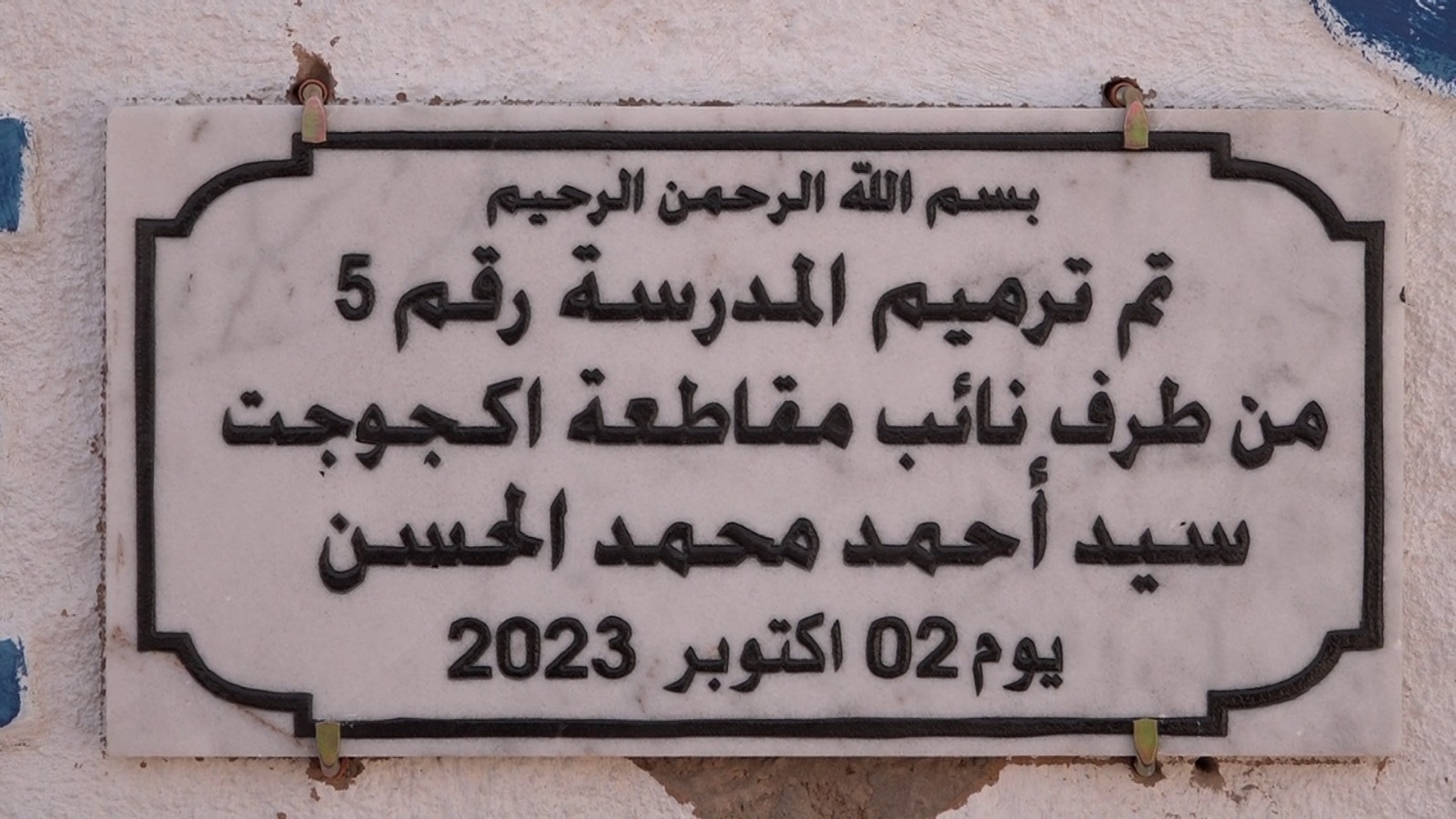 وها نحن بفضل الله وعونه، نحتفل معكم اليوم بتسليم سلطات الولاية، المدرسة رقم5 بالمقاطعة، بعد أن اكتملت عملية ترميم وتجهيز شاملة لأقسامها وطاولاتها وسبوراتها، بالإضافة إلى بناء وتجهيز مكتب إداري ومطعم ومخزن للكفالة المدرسية، وملعب وساحة خضراء بها".