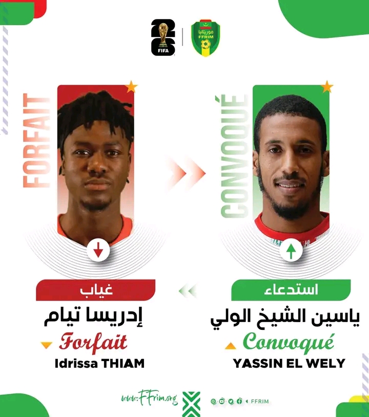 اعلنت الاتحادية الوطنية لكرة القدم عن إصابة اللاعب إدريسا تيام. و سيغيب اتيام عن المباراتين المرتقبتين ضد كل من جمهورية الكونغو الديمقراطية وجنوب السودان. و قرر الناخب الوطني أمير عبدو استدعاء ياسين الشيخ الولي لتعويض هذا الغياب.
