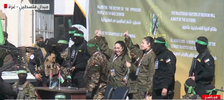 تسلم الصليب الأحمر الرهينات الإسرائيليات الأربع بميدان فلسطين وسط مدينة غزة.