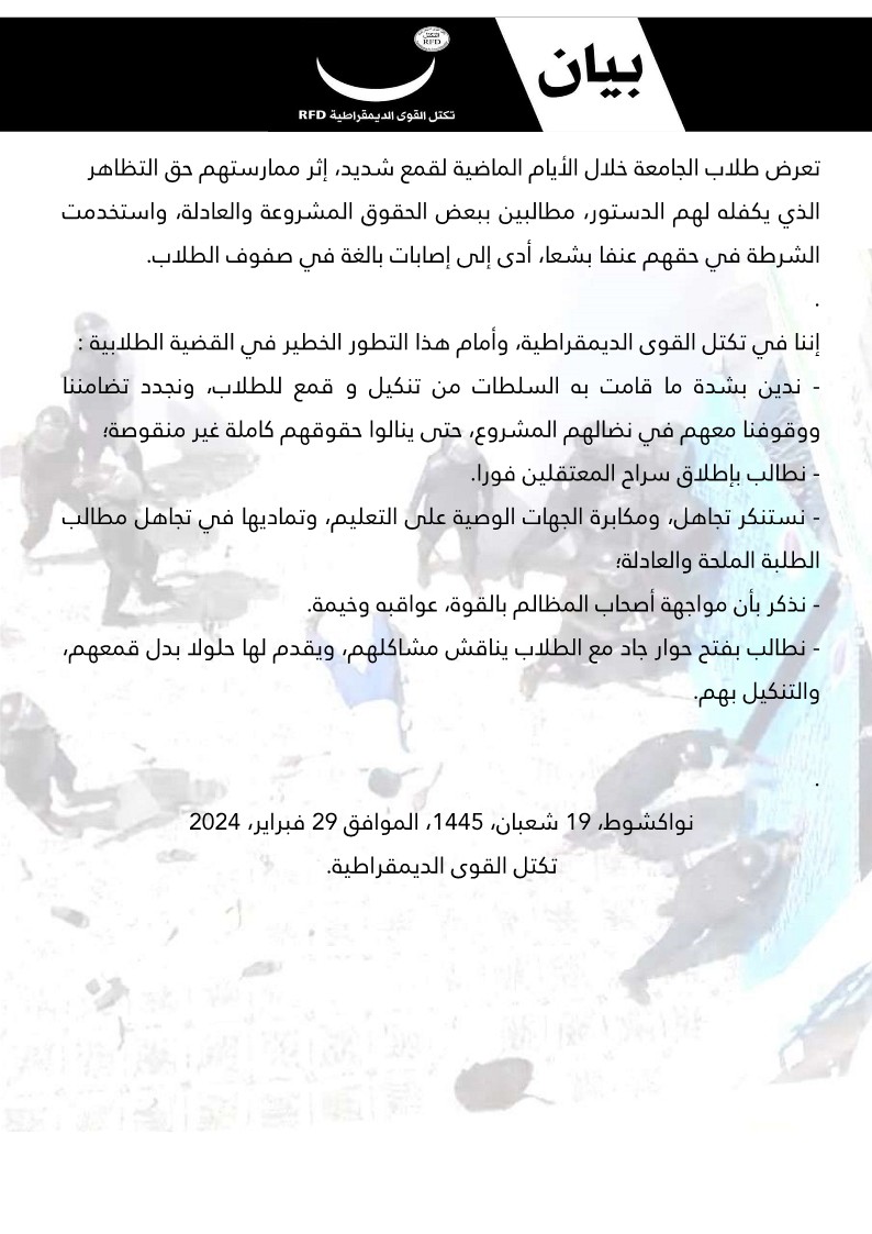 دان حزب تكتل القوى الديمقراطية ما قامت به السلطات من "قمع وتنكيل" بالطلاب، مجددا وقوفه معهم في نضالهم الذي وصفه بالمشروع حتى ينالوا حقوقهم كاملة غير منقوصة.