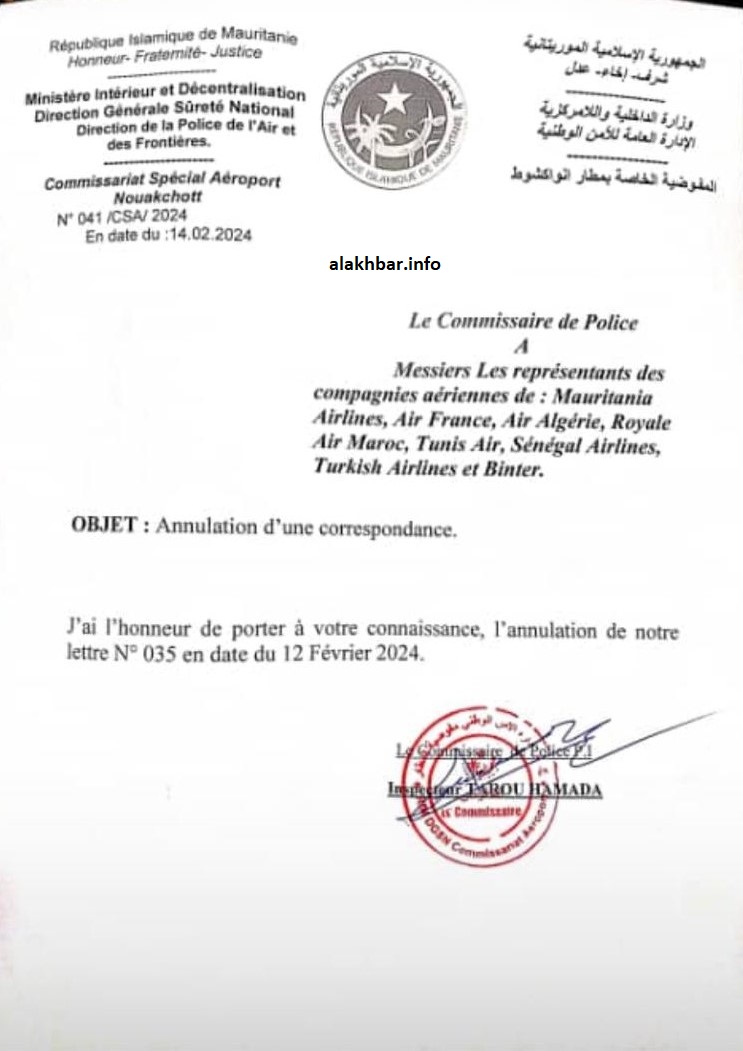 وقع مفتش الشرطة تارو حماده مذكرة موجهة إلى ممثلي شركات الطيران العاملة في موريتانيا، ألغى بموجبها المذكرة الصادرة عن المفوض السابق لمفوضية الشرطة في المطار أحمد ولد ماموني، والتي أدت لإقالته من منصبه.