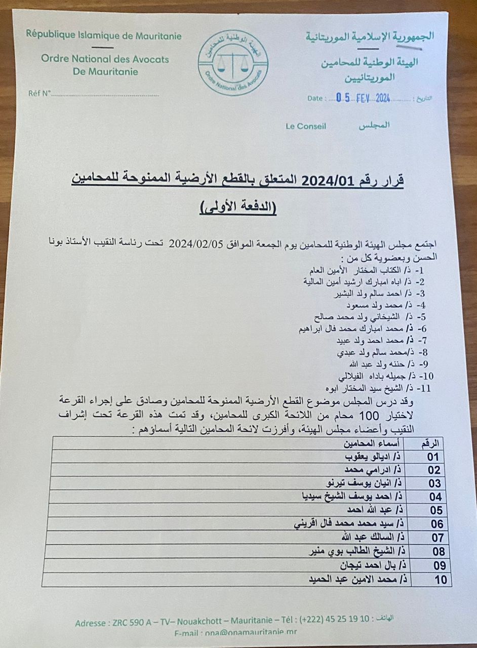 منحت الحكومة الموريتانية قطعا أرضية للمحامين، وقد أعلنت هيئة المحامين اليوم أسماء 100 محام استفادت من 100 قطع أرضية، وتم اختيارهم عبر قرعة أجراها مجلس الهيئة على اللائحة الكبرى للمحامين.