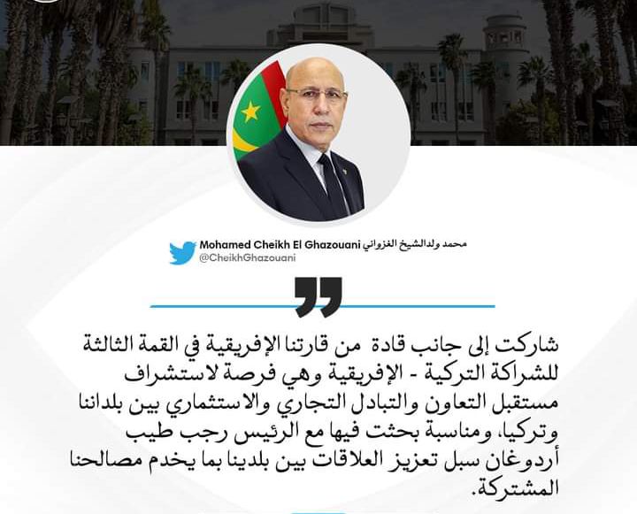 أكد رئيس الجمهورية السيد محمد ولد الشيخ الغزوانى أن القمة الثالثة للشراكة التركية الإفريقية هي فرصة لاستشراف مستقبل التعاون والتبادل التجارى والاستثماري بين البلدان الافريقية وتركيا.