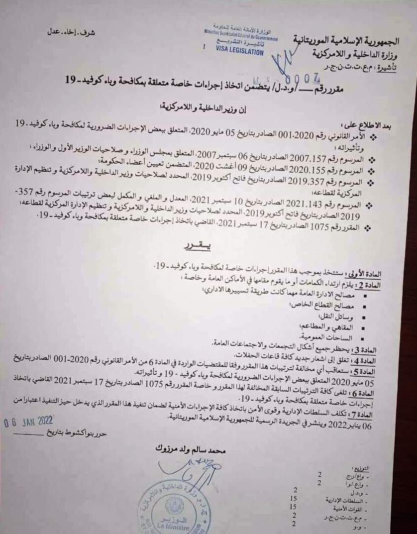 وجاء في المقرر اتخاذ اجراءات منها فرض ارتداء الكمامات في الأماكن العامة ووسائل النقل والمقاهي والمطاعم، والساحات العمومية.