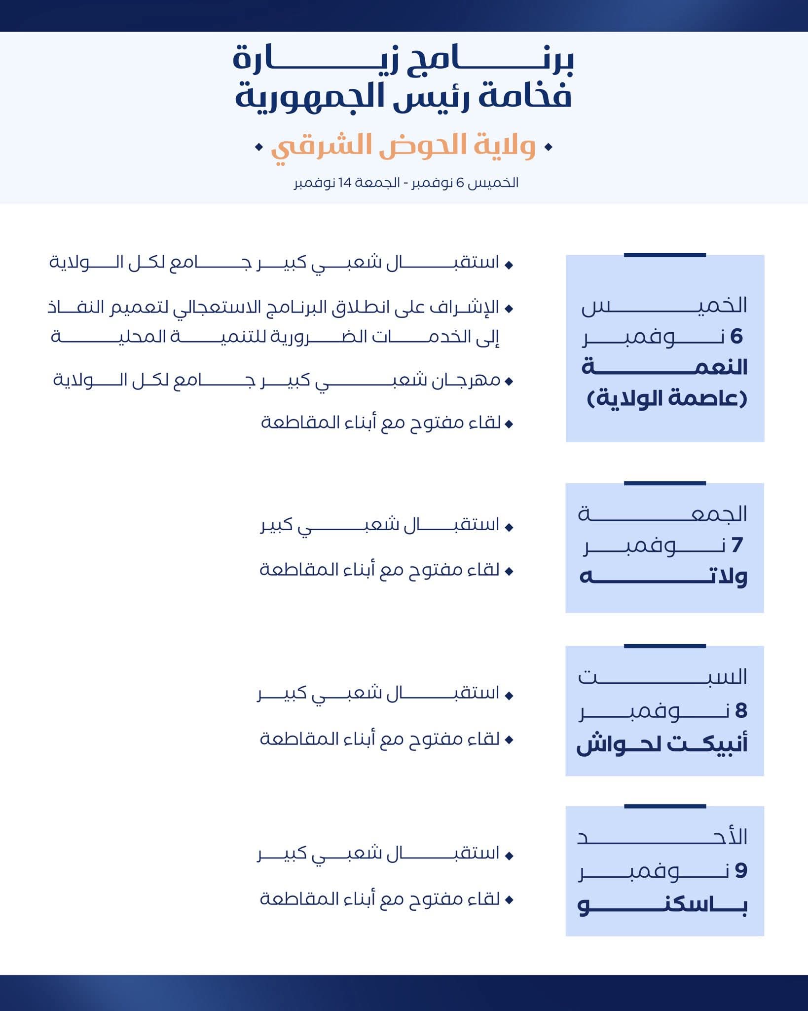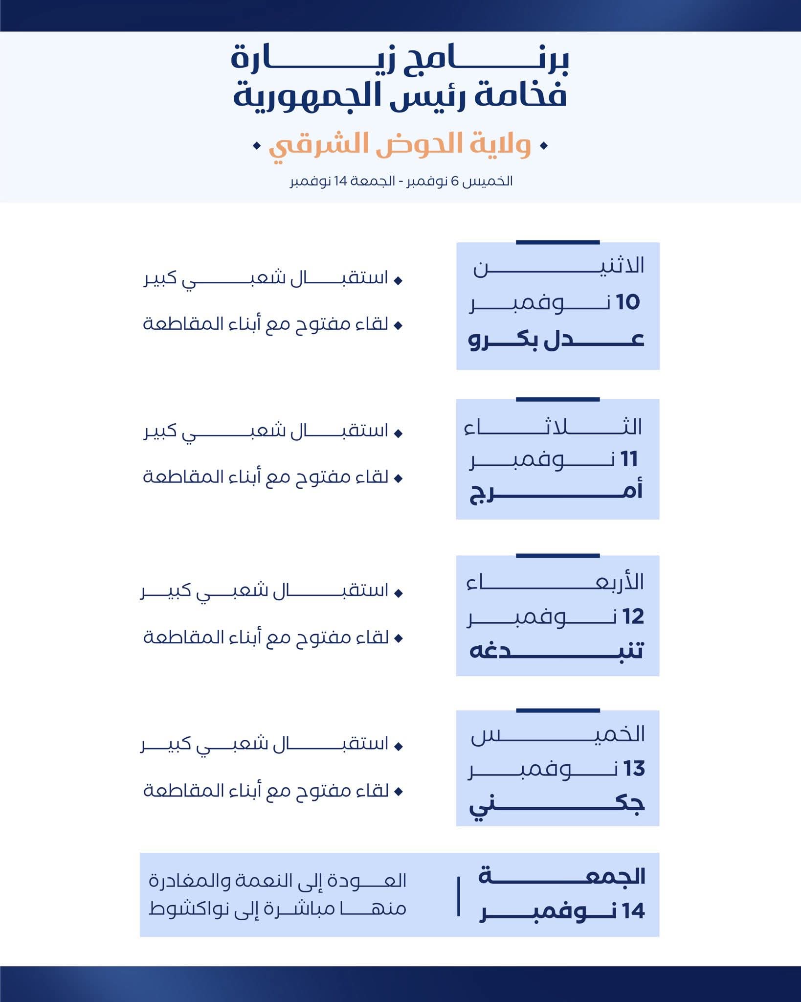 ويشمل برنامج اليوم الثاني من الزيارة استقبالا ولقاء مفتوحا مع سكان ولاته، يليه في اليوم الثالث استقبال ولقاء مع سكان انبيكت لحواش، ثم لقاءٌ مع سكان باسكنو في اليوم الرابع من الزيارة.